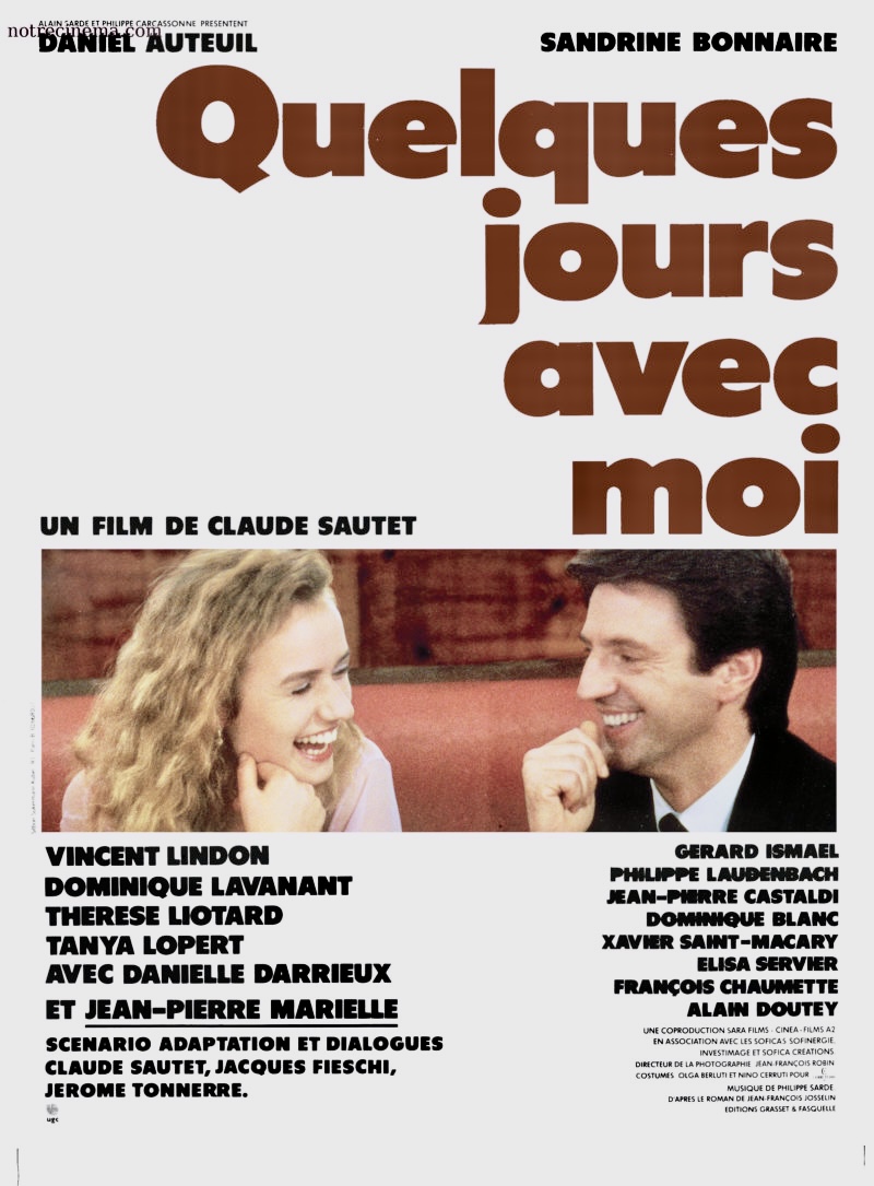 QUELQUES JOURS AVEC MOI (1988). Quelques jours peuvent suffire : le temps court d’une rencontre peut faire exploser une vie “bien rangée”. Une rencontre de classe qui dérange : l’amour comme test de vérité sociale. Héritier dépressif d’une chaîne de supermarchés, Martial débarque à Limoges pour “contrôler” — et bouscule tout. Il propose à Francine, domestique, de rester quelques jours avec lui : le pacte révèle les humiliations, les désirs, les rapports de force. Le temps de la rupture. À (re)voir pour le virage des années 80 chez Sautet : satire acide de la bourgeoisie, tendresse pour les humiliés, et Daniel Auteuil qui change de registre face à une Sandrine Bonnaire magnétique. Nominé aux César 1989. Avec Daniel Auteuil, Sandrine Bonnaire, Danielle Darrieux.