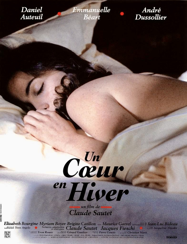 UN CŒUR EN HIVER (1992). Le temps du silence : quand on retient trop longtemps, la musique finit par dire la vérité à notre place. Le désir sans aveu : un trio, un violon, et la glace qui finit par brûler. Dans un atelier de lutherie, deux amis croisent une violoniste : l’un l’aime, l’autre la fascine par son retrait. La séduction devient un duel feutré où chacun se révèle lentement. Le temps qui gèle puis brule : Sautet filme l’émotion comme une température qui met du temps à monter jusqu’au moment où l’on comprend qu’il est trop tard. À (re)voir pour la précision chirurgicale des non-dits, l’atmosphère musicale (Ravel au cœur du récit), et le trio Auteuil / Béart / Dussollier d’une perfection troublante. Récompenses : Mostra de Venise 1992 – Lion d’argent (meilleur réalisateur) + Prix FIPRESCI ; César 1993 – Meilleur réalisateur + Meilleur second rôle (Dussollier).